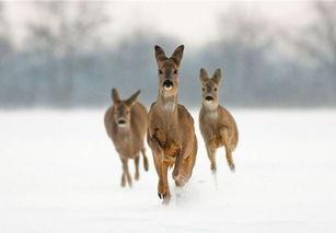 2. 雪地中的东北狍子:冬季的东北,一片银装素裹,一只东北狍子在雪地里跳跃,它的白色毛皮与雪地融为一体,仿佛是大自然的一部分。